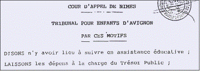 Tribunal pour enfants d'AVIGNONJugement 963/96 - ExtraitAUDIENCE tenue à Avignon en la Chambre du Conseil, le 12 novembre 1996 ..La procédure a été communiquée à Monsieur le PROCUREUR de la REPUBLIQUE ;PUIS, le Juge des Enfants a statué en ces termes :ATTENDU qu'il n'y a pas lieu de suivre en assistance éducative ; |